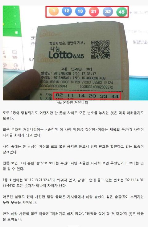 모든 숫자 하나씩 틀려 로또 1등 놓친 남성