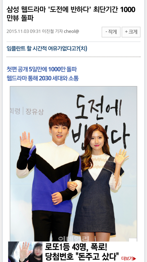 삼성그룹 웹드라마 ‘도전에 반하다’가 지난달 31일 누적 조회수 1000만 뷰를 돌파했다. 공개 5일 만에 조회 수 1000만 뷰가 넘은 것은 국내 웹드라마 사상 최단기록이다.