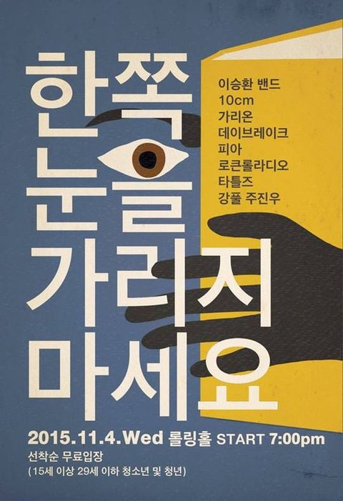 그래서 이승환 밴드와 피아, 십센치, 데이브레이크, 가리온, 로큰롤라디오, 타틀즈, 강풀 작가, 주진우 기자가 '국정화 역사 교과서 반대'라는 한 뜻을 가지고 11월 4일 오후 7시 홍대 롤링홀에 <한쪽 눈을 가리지 마세요>라는 공연으로 모이기로 했어.