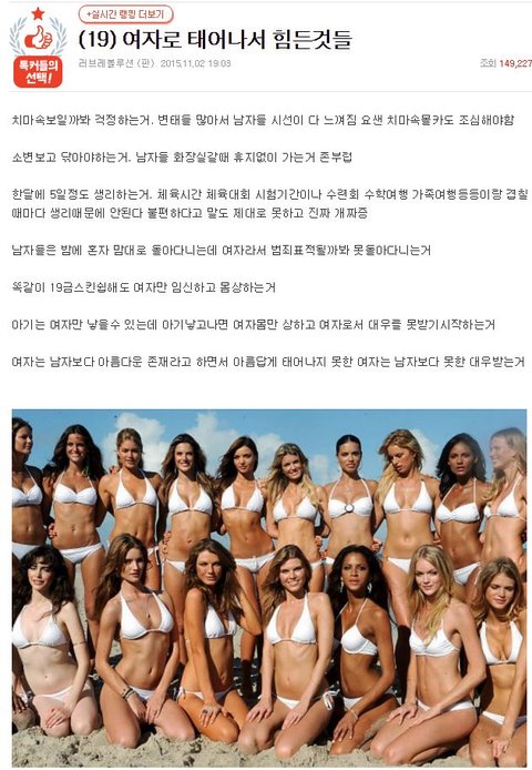 3. 한달에 5일 생리 -> 한국 여자들만 생리하나봄. 생리대 차면 되지. 실제로 생리로 인해서 통증 있는 사람은 얼마 없는데 양이 많으면 대자 차고 . 철분 잘 섭취하면 될거 가지고 별거로 유세임. 그런 별거 아닌걸로 국가에서 생리휴가라는것도 만들어줌 .리얼보지민국