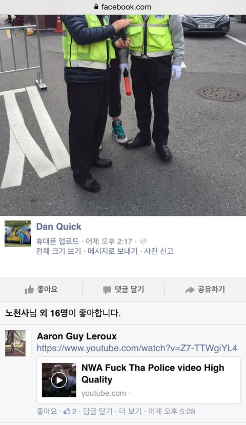 올려진 글에 추가설명은 없었고 누가 댓글에 동영상링크걸어놨었는데 그 영상제목이 'fuXX the police'였습니다. 한국에서 영어가르치는 외국인인데 어떻게 저런사진을, 게다가 페이스북에 당당하게 올릴 수 있는지.한국아이들이 저런사람한테 교육을 받는다니 진짜 기가차네요.