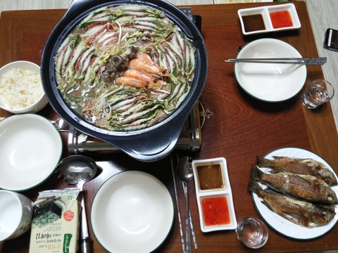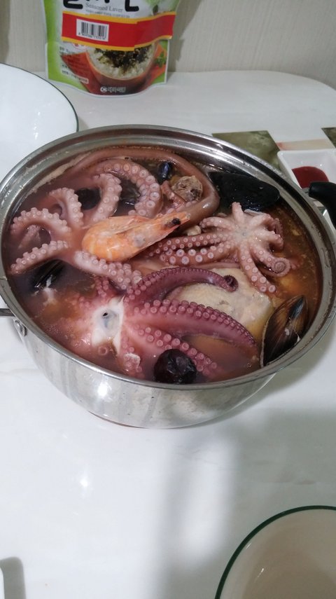 안에 푹 삶은 닭과 전복 새우 낙지 문어 홍합을 넣고 끓인 정체 모를 해천탕