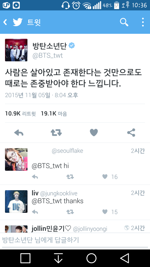 오늘 몸이 많이 안좋아서 일찍 자려고 누워있는데 아까 남준이 트윗 올린거 보다가 생각났는데 내가 진짜 존중받아도 될까 요즘 난 내가 뭘햐야할지도 모르겠고 뭘하고싶은지도 모라갰고 주변사람들한테 짜증만 내서 주위사람들이 나때문에 힘들어하는게 보여서 내가 너무 못나게 느껴져 내가 왜 그러는지도 모르겠는데 계속 예민하게 굴고 집에 있을때는 문 잠가버리고 친구들한테도 날카롭게 대하고 이러고 싶지 않은데 진짜 왜이럴까 시간도 너무 의미없게만 흘러가는것 같고 모든게 부정적으로 보이고 들려 미안해 아미들 이란 말할때가 여기밖에 없다는게 너무 싫다 또