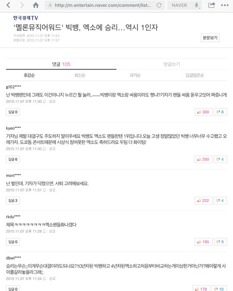 실검에 멜뮤어워드 있길래 들어가서 기사 내리니까 제목이 진짜 자극적인게 있는거임 내용도 빅1뱅>>>>>엑12소 뭐 이런 내용이었음 물론 이번에 빅뱅이 대단하게 상을 쓸었지만 이건 누가봐도 기분나빠 할 기사였음 근데 댓글이 가관ㅋㅋㅋㅋㅋㅋㅋㅋㅋ