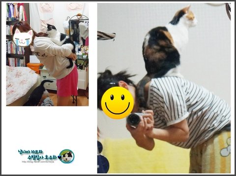 6. 아깽이 어부바 냥 / 실사버전 모델 : 왼쪽은 정석 어부바를 보여주는 피코링, 오른쪽은 업힌 자세가 뭔가 다른 유화양 ;;