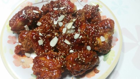 바삭하게 튀긴닭에 양념을 무친 양념통닭으로