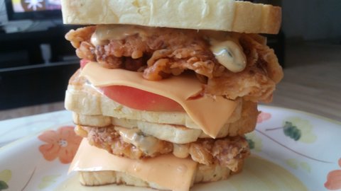 치킨샌드위치로 소스는 머스터드, 마요네즈, 케찹을