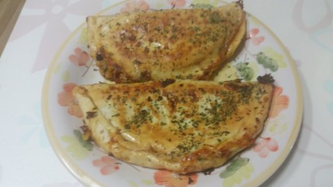 시금치, 양송이, 베이컨, 생크림 등을 넣어볶은후에 반죽한 밀가루에 넣어 오븐에구운 이탈리아 만두 칼조네(칼초네)