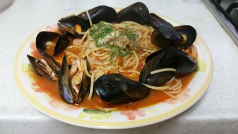 홍합육수에 토마토파스타소스, 매운소스를 넣어 만든