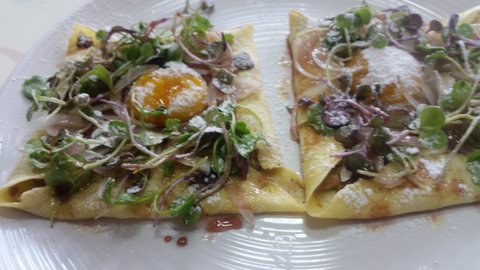 크레이프에 참치, 베이컨을 넣고 계란 노른자 올린