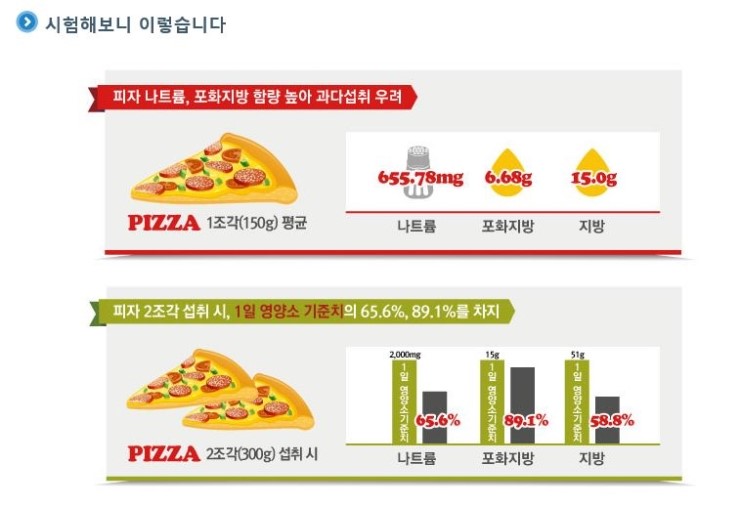 피자 2조각(300g) 섭취 시, 나트륨은 1일 영양소기준치 2,000mg의 65.6%, 포화지방은 1일 영양소기준치 15g의 89.1%, 지방은 1일 영양소 기준치 51g의 58.8%를 차지해 과다섭취가 우려되어 주의가 요구된다. 특히, 어린이와 청소년기에 포화지방 및 지방 등을 과다섭취 할 경우 성인비만으로 이어질 가능성이 높아, 영양성분 확인 및 섭취량 조절 등 올바른 식습관을 기르는 것이 중요하다.