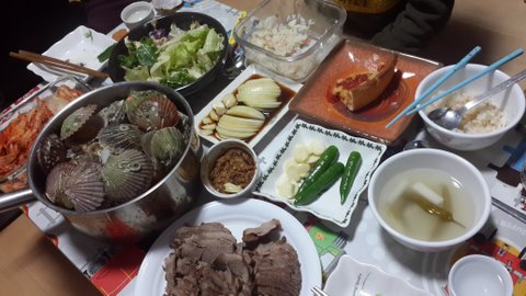 조개찜, 돼지고기수육,겉절이. 애들은 전날먹다남긴 닭죽이랑 이마트시카고피자 한조각