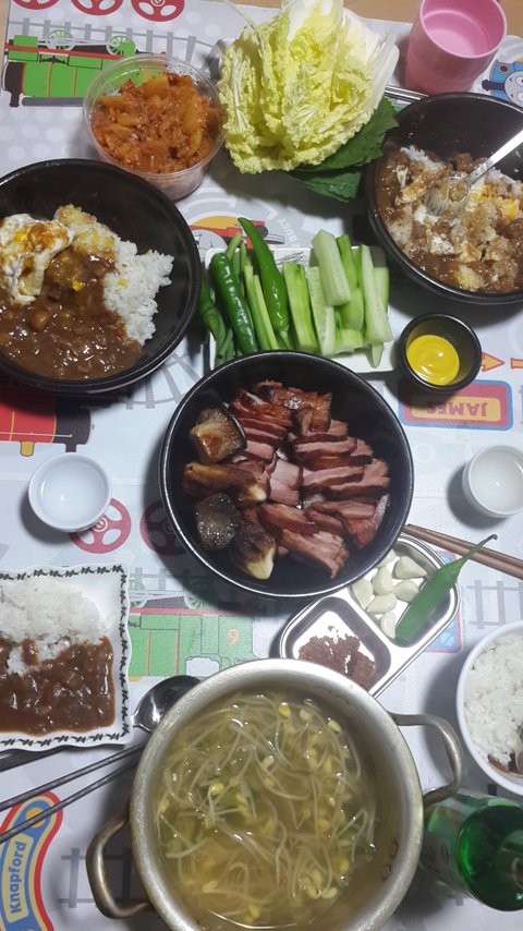 엄마아빠는 삼겹훈제랑 매운콩나물국먹고 애들은 하이라이스