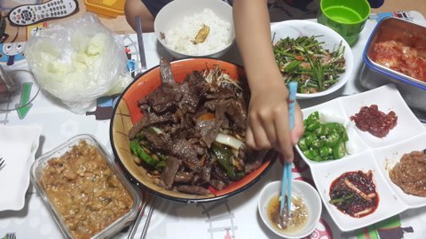 소고기 구워서...강된장이랑 양배추찜은 낮에 먹던건가봐요ㅋㅋ