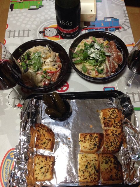 애들 미리 먹이구 우리는 와인한잔. 근데아마 애들이 소세지는 다 건져먹었던 기억이...