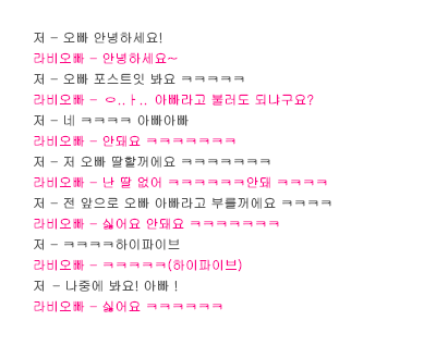 헐! 라비판이다! ㅋㅋㅋㅋ 예전에 이 글 봤을 때도 웃겼는데 아직도 웃기네 ㅋㅋㅋ 미친 ㅋㅋㅋ 입덕 했을 때 만해도 김까리가 라바일줄은...ㅎ 왕바보가 가장 쎈 욕일줄은 몰랐음;;; ㅋ