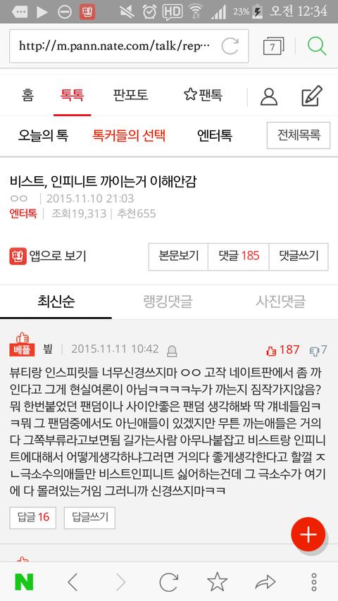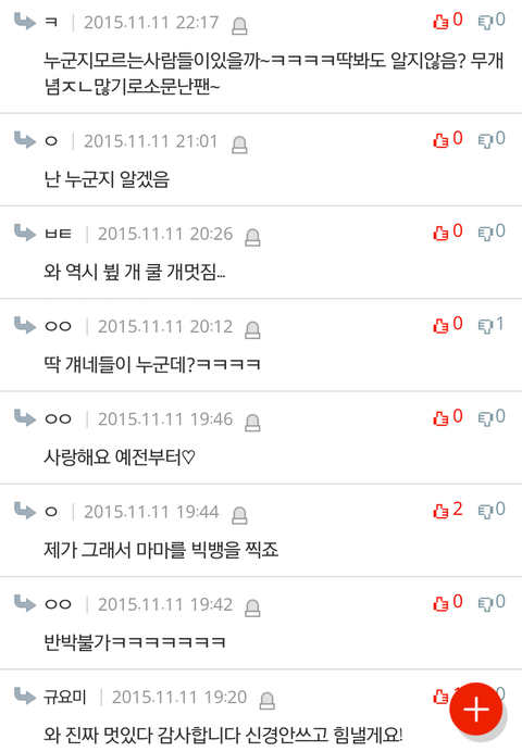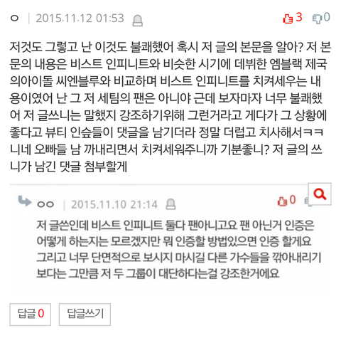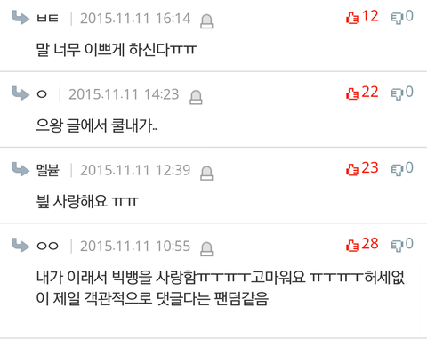 중학생애들 장난치는것도 아니고 저 사람도 참 댓글을 이상하게쓴듯 그냥 훈훈하게 마무리하면 될것이지 왜 팬덤을 추정하는문장을 써서는ㅋㅋ이익명속에서도 누가썼는지 보이는 투시능력을 가졌나ㅋㅋ저분들 현실속에서 친구한테 쓴 소리 들으면 찌질하게 자기들 sns에 의미심장한척 글올릴듯 유치하다 진심ㅋㅋㅋㅋ