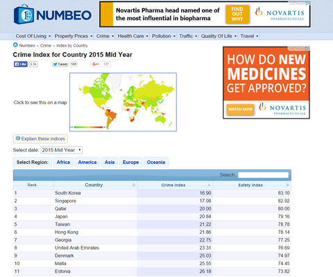 이 자료 출처는 http://www.numbeo.com/ 라는 전 구글인가 페북직원이 만든 서베이 사이트임