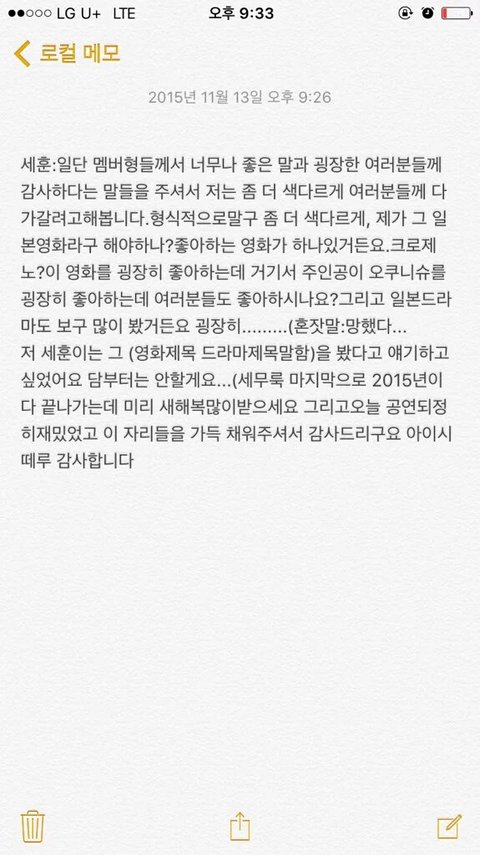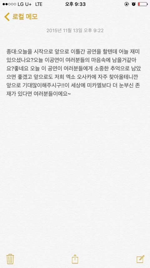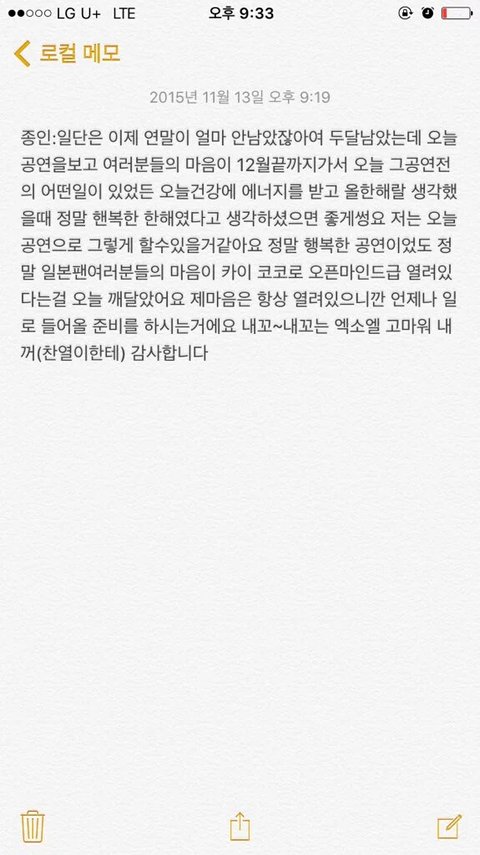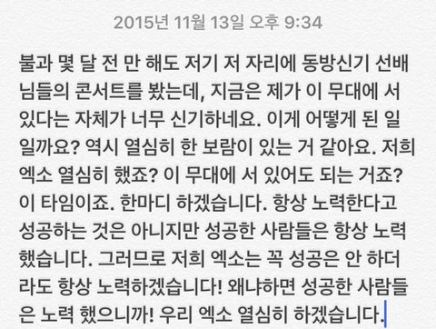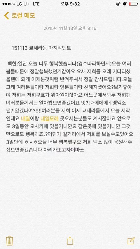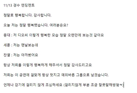 시우민센세 오츠카레시마시타 충격적인 세훈이 말부터 시우민센세의 좋은 말까지 정말 좋은 하루였습니다 오늘 엑소엘 뿐만아니라 애인 가족분들 단위로 와주신분들도 많더라고요 모두에게 기억에 남을 추억이 되었으면 좋겠고요 저희도 잊지 않겠습니다 그리고 내일과 그다음날까지 저희는 열심히 공연할거고요 내년 그리고 그 다음해도 쿄세라돔에서 공연할수 있도록 열심히 하겠습니다 싱글 앨범을 시작으러 일본에 여러가지 활동이 있을 예정인데요 기대해주세요