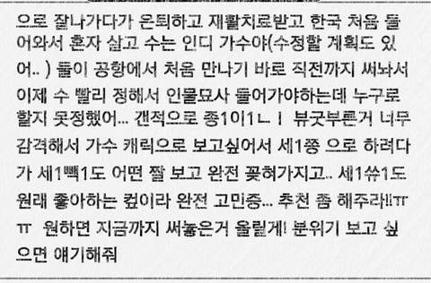 뉴1욕 양1키1스에 잘나가는 타자 중에 어렸을 때 입양된 한국인 한명 있는데 그 사람을 모티브로 세1후ㄴ1이 캐릭을 정했어 (공이야) 공이 야구선수로 잘나가다가 어깨부상으로 은퇴하고 재활치료받고.. 그리고 이 다음부터는 사진에 있는 글 읽어주라 계속 글 업로드가 안돼서 캡쳐해놓은거 올릴게