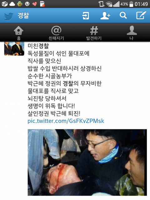 + 현재 안면으로 물대포맞고 쓰러진 농민 할아버지는 의식불명에 위독한 상태임