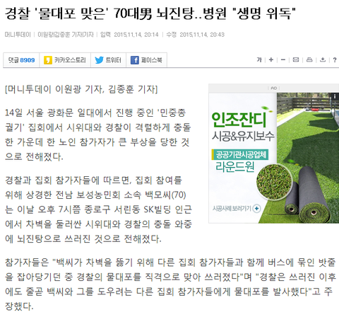 물대포맞고 뇌진탕으로 쓰러진 할아버지한테 계속 물대포 발사함