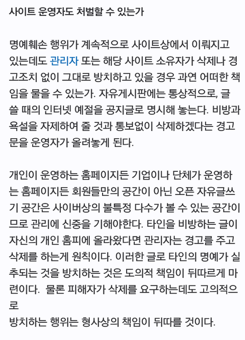 (누구든지 정보통신망을 통하여 음란물, 지적 재산권/저작권 침해 자료, 선거법에 어긋나는 자료, 타인의 명예를 훼손하는 자료, 청소년 유해자료, 기타 위법 자료 등을 게시하거나 전송하는 경우 게시물은 경고없이 삭제되며, 게시자는 각 해당 법률에 따라 민·형사상의 책임을 질 수 있습니다.) 지네들이 아래에 이런거 다 보이게 올려놓고 연예인 본인이 신고해야 삭제한다며 배짱부림