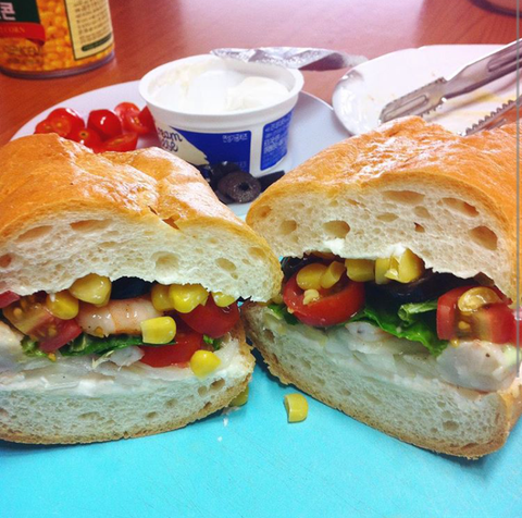 바게트쉬림프샌드위치! 이것도 비주얼폭발..맛도 폭발..하악하악 버터에 구운 새우랑 바질 시금치 토마토 크림치즈 블랙올리브 콘 들어갔어요!