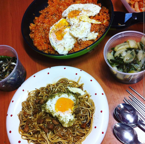 목살볶음밥과 심야식당 마스터의 소스야키소바! 마스터 따라 파래가루도 후라이 가에만 뿌럈어요ㅋㅋㅋㅋㅋ 목살볶음밥을 맛있게 하는 비법은 양념소스에 있어요!! 고추장 참기름 간장 다진마늘 설탕 빻은깨 물엿 이렇게! 참기름이 맛을 좌지우지해요! 많이넣을수록 맛있어요!
