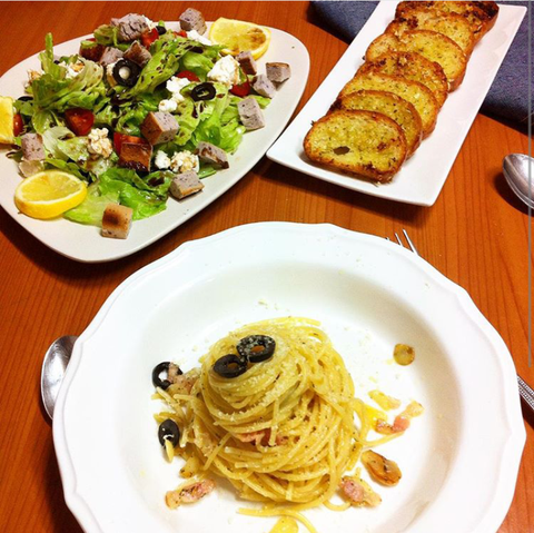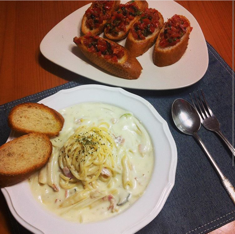 이건 언니가 먹고싶다고 졸라서 만든 까르보나라랑 토마토부르스케타에요! 부르스케타에는 토마토 씨를 제거하고 생바질이랑 블랙올리브를 다져넣고 레몬제스트와 통후추를 갈아넣고 발사믹식초와 올리브오일에 고루 버무려요! 사실 이것만 먹어도 진짜 맛있어요 완전 프레쉬한 맛!