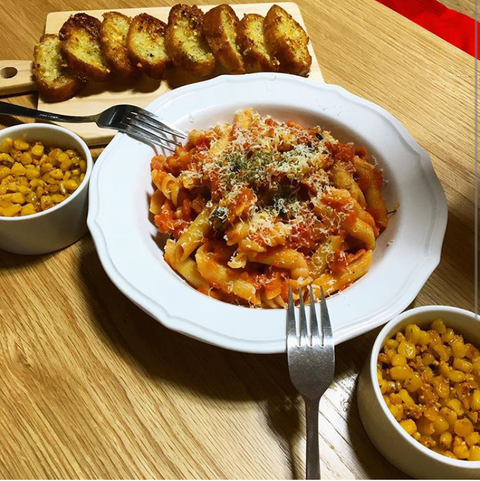 토마토펜네파스타랑 마늘바게트 버터옥수수에요!!