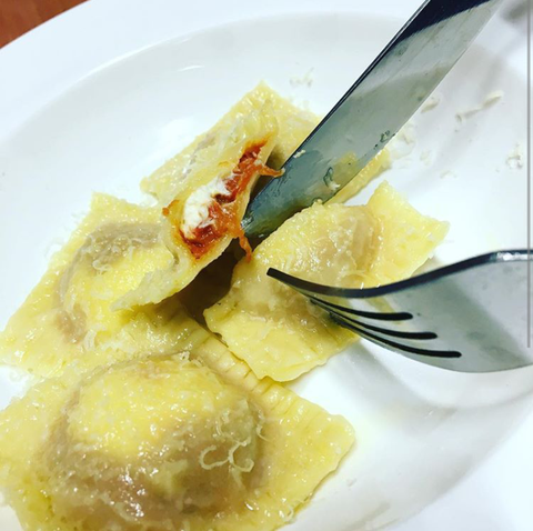 토마토와 크림치즈 바질로 속을 채운 라비올리에요!