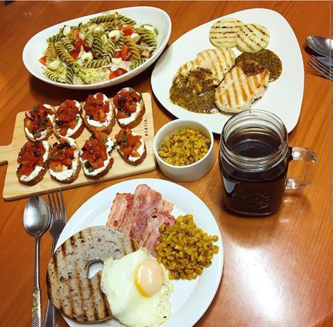 이정도면 브런치카페 안부럽쥬? 그릴치킨스테이크, 크림치즈 토마토 부르스케타, 베이글과 구운 베이컨 버터옥수수, 바질페스토에 버무린 푸실리 냉파스타샐러드에요! 그리고 아으메으리카노!!