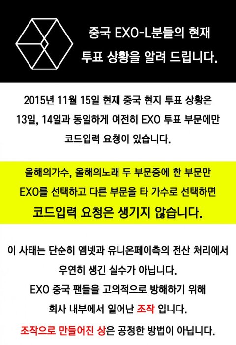 그런데도 불구하고 이번 2015MAMA투표에서 조작이라는 의혹을 불러일으키는 수많은 정황이 포착되어 이렇게 글을 쓰게 되었음.