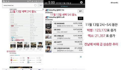 빅뱅은 123172표가 올라갔다고 중국에서 팬카페나 웨이보로 추청했을때 엑소가 인기가더많으면많았지 덜하진않을텐데 이렇게까지 차이가 나는건 말도안됀다고 해줘