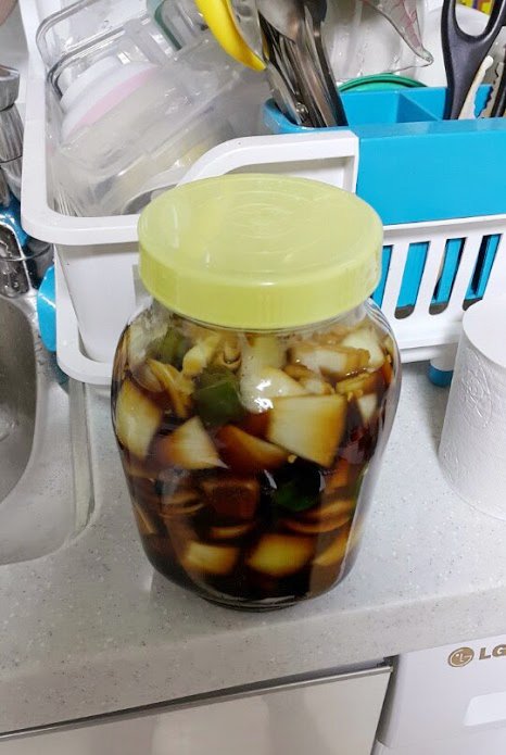 술안주로 양파짱아찌를 만듭니다. 별짓을 다한다고 욕먹습니다.