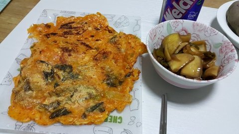 청양고추 넣은 김치전에 양파짱아찌가 등장합니다.