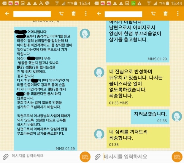 저희 어머니도 이 상사에게 성추행 하지 말라는 문자를 보냈고 카톡으로 저에게 성추행 한일에 대하여 여러번 미안하다고 간접 시인을 하였습니다.