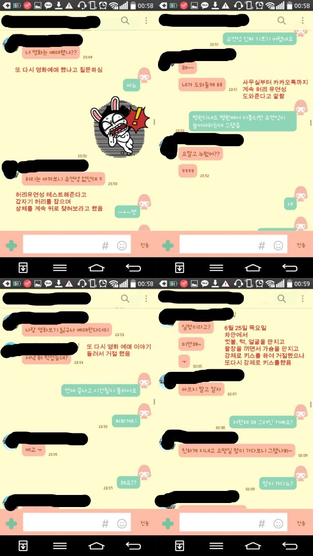 그럼에도 이후에 계속 찜질방 같이 가자는 권유와 메 신체의 스킨쉽 강압적인 당김에 사무실을 도망가나 여성민우회에 수차례 전화한 일도 있었습니다.