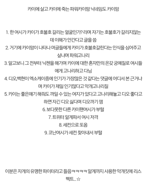 얘 말하는거 아니야? 인기집착하고 백현디오 인기많다고하면 개거품물고 댓글달던 카이맘;; 카이맘 포기하고 관심끊어서 그이후로는 잘몰라