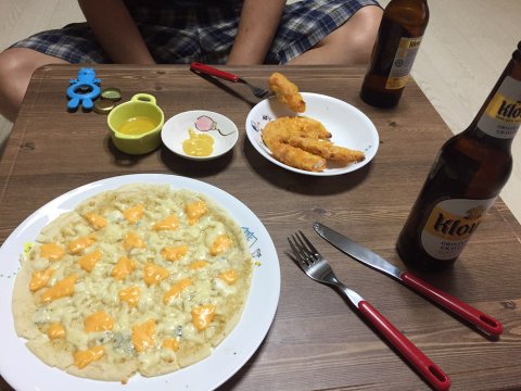 - 급 술안주 고르곤졸라피자와 치킨텐더 (집에 있는 치즈는 다 짬뽕해서 넣음 ㅋㅋ)