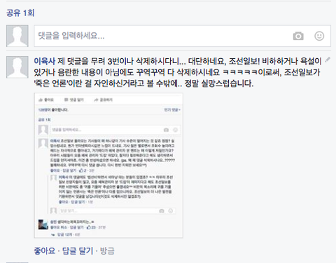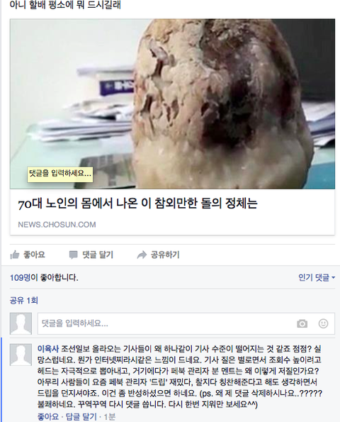 그런데 요새들어 조선일보에 계속 질이 낮은 기사가 올라오고, 페이스북 관리자의 '드립'이 도가 지나칠 때도 자주 생기게 됐습니다.