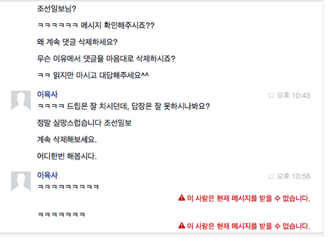 그리고 나서 보니, 제 계정이 조선일보로부터 차당을 당했더라구요.댓글도 못 쓰게 해놨을뿐더러, 메시지도 못 보냅니다.