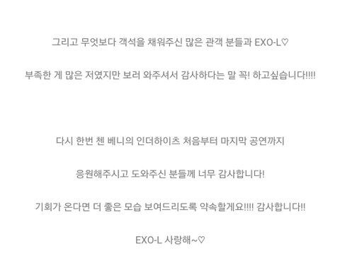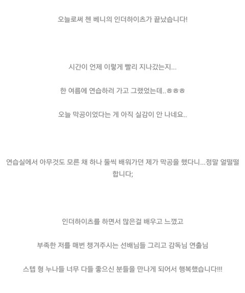 종대가 뮤지컬 한다고 했을 때 정말 기뻤고 연습하는 모습을 보면서 너무 뿌듯했고 무대 위에서 정말 최고였어ㅠㅠ 스케줄 틈틈히 연습하고 며칠 연속으로 노래 부르고 뮤지컬 하고 에너지 드링크를 손에들고 바로 고척돔으로 달려가는 널 보며 걱정도 됐지만 항상 최선을 다해서 멋있다 수고많았어 첸베니