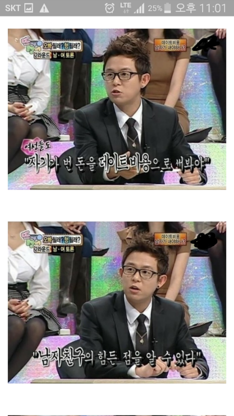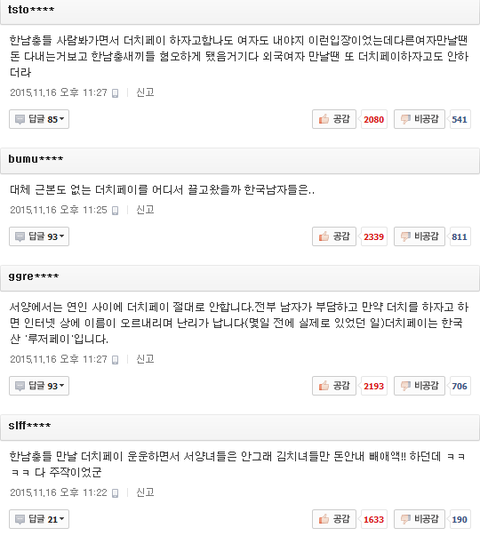 거기 한국 네티즌들 미안한데, 난 유럽국가에 사는데 난 절대로 다내려고 하는 남자와 데이트하지않아. 만약 네가 재정적으로 파산한 상태가 아닌이상 누군가와 데이트할때 비용을 나눠야만해. 남자가 다 내야한다는건 16세기 사고에 갇혀 사는거야.