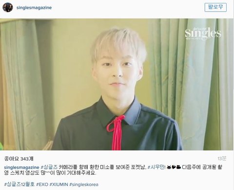 "안녕하세요 엑소의 시우민입니다! 앞으로도 싱글즈 많~~이 많이 사랑해주세요옷! 안뇽~~"