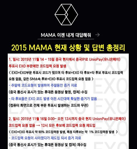 처음에 엑소+엑소 투표하면 엑소는 99%의 비율로 코드가 뜨고 빅뱅은 1%의 비율로 뜨더니 항의 후에 빅뱅한테 코드가 생기더니 이제는 전체에 생김 ㄷㄷ 아이피 당 한 번이라면서 그런데 왜 투표 한 번도 하지 않은 팬한테도 코드가 뜨는지 설명해줄 수 있닝?