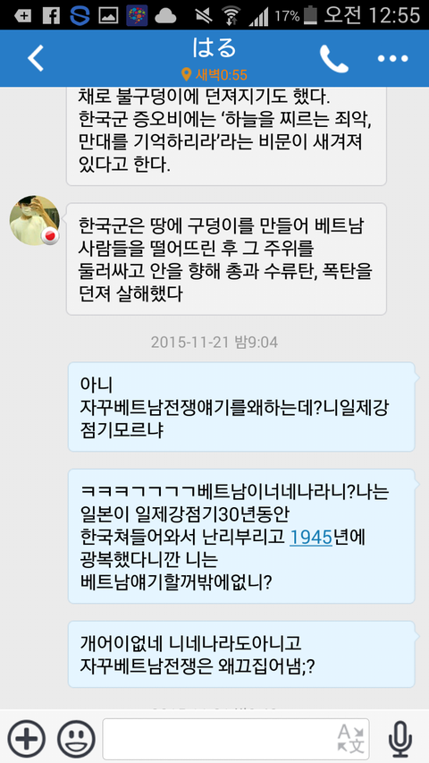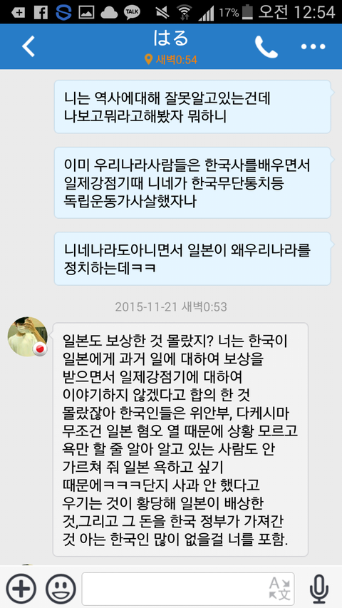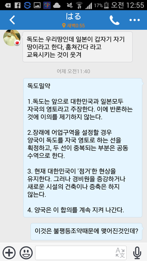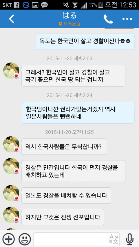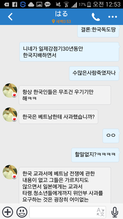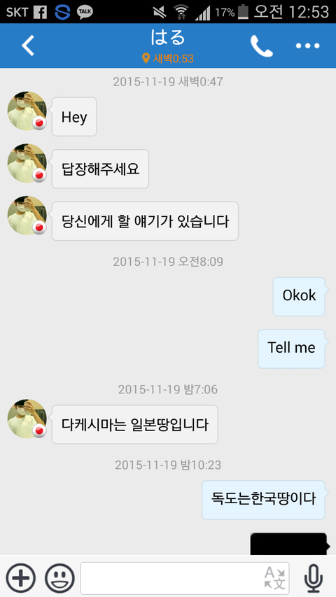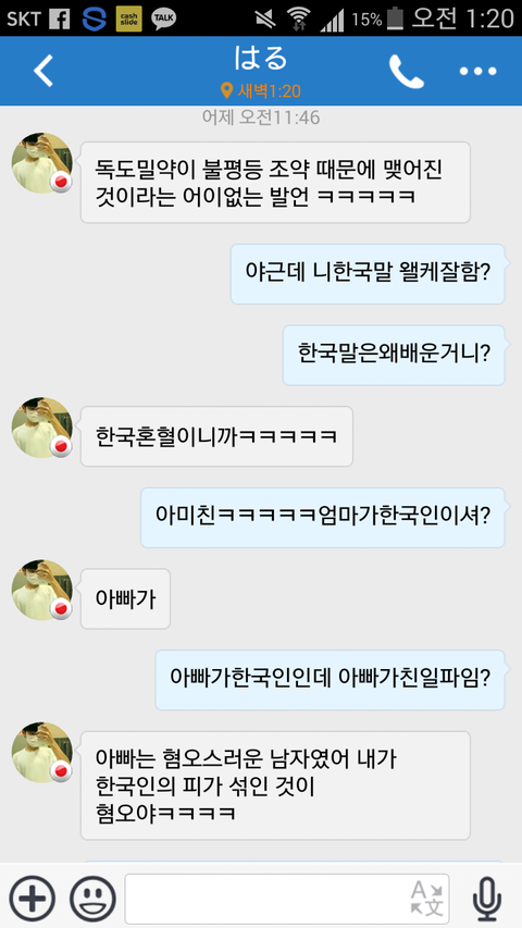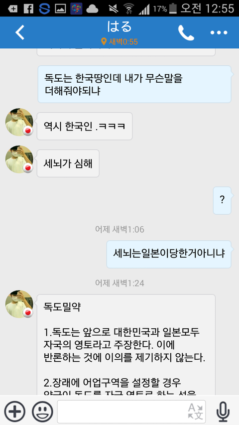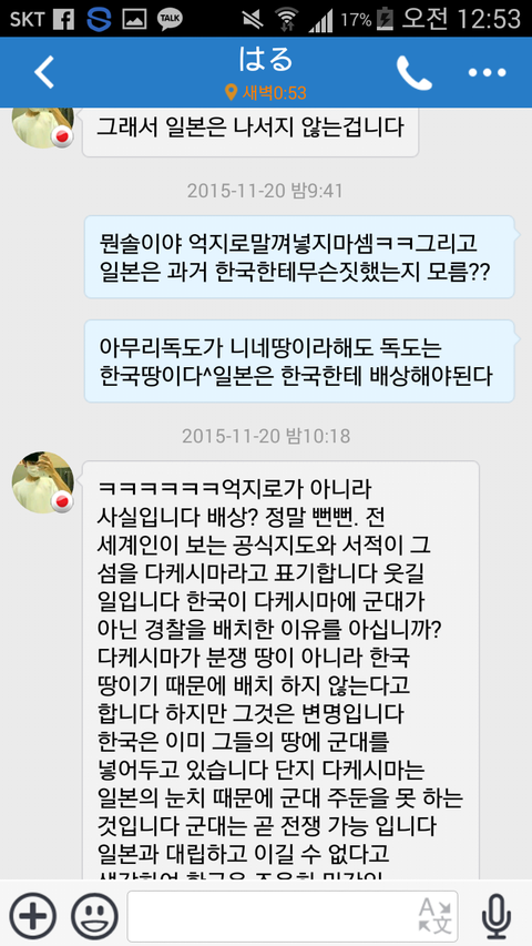 논리로반박하라는분들 솔직히 일본애가 메세지한번보낼때마다 10개이상씩장문으로보내는데 솔직히 읽지도않아서 반박을안했어요..진짜 독도는우리땅인데 저렇게 10문장씩 한꺼번에날라오면 막상 못찾겠더라고요