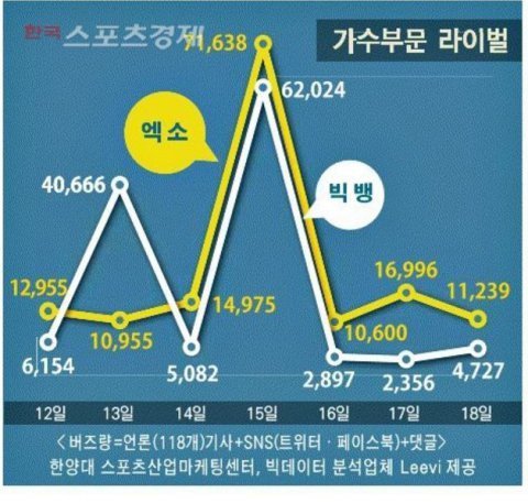 엑소는 12일~18일 1주간 국내 118개 매체의 기사수와 SNS 언급횟수, 포털 사이트 댓글 수 등을 합산한 버즈량에서 14만 9,358건을 기록했다. 지난주 19만 4,148건보다 다소 하락했지만 빅뱅, 아이유를 제치고 1위에 올랐다. 2위는 빅뱅이 12만 3,906건이며 전주 90만여 건을 올렸던 아이유는 5만 3,462건으로 급격히 줄어 3위를 차지했다.