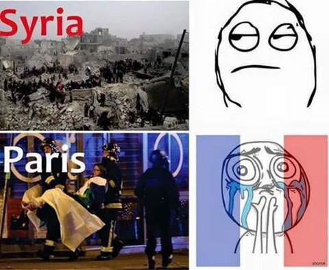 ㅇㅇㄹㅇ 시리아 별볼일 없으니 그냥 그런가 보다하고 프랑스는 뭐 있어서 저러나 싶음ㅋㅋㅋ 이번만이 아님 뭔 사건 날때마다 sns에선 뭐 추모하네 뭐하네 하면서 저 지랄하면서 속은 전혀 아니잖아;
